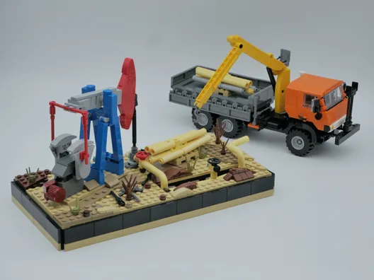 - локация с нефтенасосом, грузовиком и продукция компании «ЗСТ» - трубы, используемые для транспортировки нефти