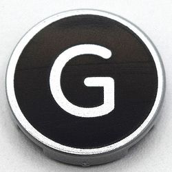 Tile, Round 2 x 2 with Bottom Stud Holder with Silver Capital Letter G on Black Background Pattern, Light Bluish Gray (14769pb428 / 6352990)